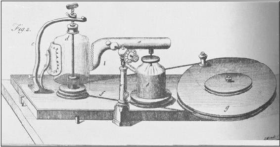 Maschinen,Leipzig,1744)。他必定已认识到,必须把这种摩擦物接地。后来,这种摩擦物很快就成了既定型式。但是,温克勒在该书中还描述了一部起电机,其中由一块踏板操纵一根长玻璃管,使之前后移动,从而摩擦封闭在其中的一块织物。他还描述了一种绕轴旋转一个酒瓶的装置,它用一块踏板和弹簧操纵一根缠绕在轴上的绳索,绳索使瓶交替地沿两个方向转动,有点像用绞索操纵钻头。温克勒在《电物质的性质》(Die Eigenschaften der elektrischen Materie,etc.)(莱比锡,1745年)中描述了另一种机器,其中原导体被作为部件装进机器。J.G.克吕格尔认识到,原导体越长,它起电时给出的电击就越强(Zuschrift an seine Zuhörer,Halle,1745);到富兰克林才认识到,(在给定环境条件下)电击取决于导电表面的面积。A.戈登在其《电学演示实验》(Versuch einer Erklärung der Elektricität,Erfurt,1745)中描述了一种他自己制造的机器,其中有一个玻璃圆筒顶住一块皮垫旋转(图97)。原导体是一根与机器其余部分分离的铁管;当机器开动时,铁管的一端被提升到离玻璃筒不到四分之一英寸的地方,用于收集电荷。(参见F.Rosenberger:Die erste Entwicklung der Elektrisirmaschine,载Abhandlungen zur Geschichte der Mathematik,Heft