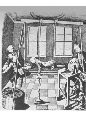 起电机很快风行起来,富有的业余爱好者所拥有的起电机最后占了绝大部分。摩擦电的其余主要现象这时很快被相继发现。电火花的引燃作用从炸药、乙醚、酒精和磷等等物质得到证明。图103示出这样的一个实验,图中电荷从起电机通过一个绝缘的人体传送到一种可燃物质。格但斯克的市长格雷拉特按这种办法用电火花把他刚吹熄的一支蜡烛重新点燃,且还表明,酒精甚至能用起电的水喷注点燃(Versuche u.Abhandl.der naturforschenden Gesellschaft in Danzig,1747,p.507)。