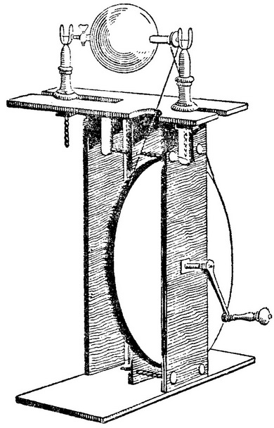 8,No.3,1898。)其后在十八世纪中期起电机设计上又有进步,约瑟夫·普利斯特列在他的《电学史》(History of Electricity)(第3版,伦敦,1775年,Part V,Section II)中对此有所介绍。该书谈到的起电机包括沃森的起电机,其中三、四个同时旋转的玻璃球被摩擦(图98);威尔逊的起电机首次用一个金属梳收集一个起电圆筒的电荷(图99);里德的机器把原导体连同它的齿形集电器都连接到一个莱顿瓶的内部;在另一种机器中,借助齿轮传动装置使一个玻璃球快速旋转(图100)。普利斯特列注意到,有一种型式很特别的起电机(图101),它似乎是1766年前后由英根霍斯和拉姆斯登或许还有普兰塔各自独立发明的。这种机器主要是一个圆玻璃板;它在一个垂直平面上旋转,靠连接在通过圆玻璃板中央的一根铁轴上的一根曲柄驱动;玻璃板每一面在其垂直直径的两对端上设有四个垫子,它们摩擦玻璃板。原导体是一个中空的黄铜管,其上伸出两根带有集电尖端的水平分肢,与玻璃圆盘相距不到半英寸,各用来收集一对垫子激发的电。普利斯特列还描绘了他自己的起电机(Vol.Ⅱ,p.112f.):“我对这个问题潜心钻研的结果。”他表明了两种形式,主要是一个球形玻璃烧瓶,一根金属轴被黏结到烧瓶的颈中,但不穿透玻球(图102)。摩擦物压在玻球上,通过旋转金属轴来转动玻球,由带尖端的金属丝轻轻扫过球面来收集所产生的电荷。