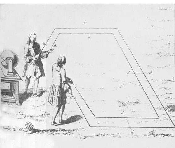 诺莱和L.G.勒莫尼埃没有理会米欣布罗克的警告,立即重复了莱顿实验。诺莱的实验成功了,用的是普通的法国玻璃容器,只要是干燥的就行。于是,他得出结论:在米欣布罗克的实验中,除了德国玻璃容器是干燥的而外,其他肯定都是潮湿的,这便解释了为什么用它们不能给出肯定结果的原因。诺莱发现,水作为充入容器的液体最好,但其他液体(特别是水银)也可以,只要它们不含硫磺或油,甚至粉末或铁屑也可用。另外,容器必须是玻璃的或瓷质的;即使硫也不能用来代替它们。电击的强度似乎取决于容器的大小。在同一卷《备忘录》(pp.447—64)中,勒莫尼埃描述了他自己利用莱顿瓶所做的一些早期实验。这些实验主要是观察让瓶放电的结果,放电通过的电路由人手拉手形成的链构成,或者用链条或长金属丝联接而成,后者能通过潮湿草地或新挖的土地,或绕在树木上而不减损电击的力量。勒莫尼埃成功地让电击通过浸在古王宫和王家花园的湖泊中的两根金属丝之间的水。为了测定放电的传播速度,勒莫尼埃在一所卡尔特教团修道院的一个场院上设置了两根平行的长金属丝。一个观察者用两只手抓住金属丝的两个远端,而两个近端,连接到一个充了电的莱顿瓶的外部,另一个连接到莱顿瓶的球形头(图105)。观察者判断电路闭合后瓶上通过火花的时刻和他感到电击的时刻之间的时间间隔。但所有观察者都一致说,他们觉察不到这间隔。