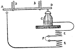 在莱顿瓶初期的各种改进中,有一种是沃森作出的。贝维斯已在瓶外面涂上一层箔;他甚至似乎已用涂有金属箔的玻璃片制成了电容器。沃森也在瓶的内壁类似地涂上了衬里,而且瓶子里不再充液体,这样,他实际上使瓶成为今天的式样(Phil.Trans. ,1748,pp.92ff.)。他也是最早试图测定电在一根金属丝中传播速度的先驱之一。1748年,沃森和皇家学会的其他一些会员在舒特山用长度超过2英里的一条线进行了实验,得到的结果是否定的。瓶C(图106)通过线路CEFABD放电。在线路F处接入的一个观察者发生痉挛性动作的时刻和远处火花隙A通过一个火花的时刻间的时间间隔是觉察不出来的,这表明速度至少是很大的。欧洲各地以及富兰克林在美国很快重复了这些实验。