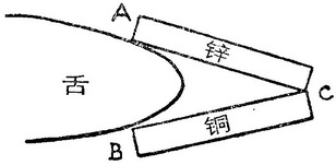 1750年前后,一个德国数学教授J.G.祖尔策首先注意到,在一定条件下,仅使两种金属接触,就能产生一种奇异感觉。但是,后来人们才把这效应与电联系起来(Theorie der angenehmen und unangenehmen Empfindungen,Berlin,1762)。祖尔策有一次碰巧用他的舌尖放进两块不同金属之间,而它们的边缘是相接触的。他注意到,有一种刺激性的感觉,使他想起绿矾的味道。当把两块金属分开放在舌头上时,便没有产生什么。这个实验(如图119所示)可很容易地重复。将舌头伸进擦洗干净的锌片(A)和铜片(B)之间,两者沿边缘(C)相接触地放置。祖尔策认为,当把两种金属放在一起时,大概不会发生什么分解作用。他猜想,这两种金属的相触大概引起了它们的微粒振动,而这种振动刺激了味觉神经。在这种实验后来的一种形式中,一个锡或锌的烧杯被安装在一个银制支座上,里面盛有水。当把舌尖浸入水中时,只要不与银支座接触,舌尖就不会感到任何味道。但是,若同时用湿手握住银支座,就会感觉到有一种独特的味道。祖尔策的发现当时还只是一种孤立的观察事实;正像这类事情常见的结局那样,它也未引起注意,最后被人们遗忘,直到科学的进一步发展导致必然地回到这个发现。