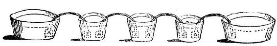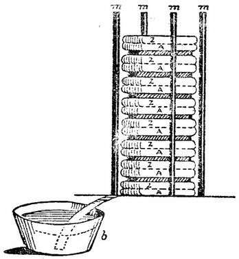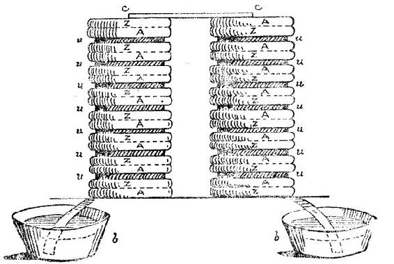 这一已证明是绝顶重要的发明的最早说明见诸伏打致皇家学会会长约瑟夫·班克斯爵士的一封信中,时间是1800年3月20日(Phil.Trans. ,1800,p.403)。他在信中说,在他进行接触电实验的过程中,他成功地制成了一种新装置。他说,它具有非常微弱程度上的莱顿瓶性质,但又具有一个远远优于莱顿瓶的特点:无需从外部充电,而只要按适当方式接触便可自发地生电。他把这种装置的作用和布置比作电的电器官。伏打的第一种电堆示于图124。他这样描述它的结构:“取30块、40块、60块或更多块铜片,银片更好,使每一块都施加于一块锡片,或者锌片,那更好得多。取同样数目的水层或其他诸如盐水或碱液等导电性能优于纯水的液体层,或者同样数目在这些液体中浸泡过的卡纸或皮革等等,这些层夹在每对或每个组合所包含的两种不同金属之间。一个这种间隔的系列,并且这三种导体总是按同样顺序排列,就构成了我的仪器。”(Phil.Trans. ,1800,p.403)