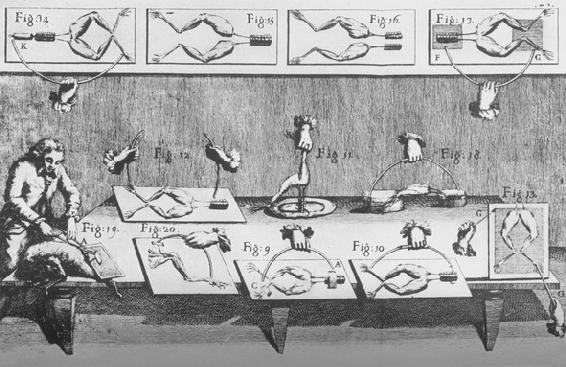 伽伐尼注意到,若把制备的蛙缚于一个铁格子,并把黄铜钩刺进脊髓,则不仅在雷雨天气,而且甚至在晴朗天气,也会出现偶发的痉挛。他想,这些运动肯定是因大气电状态的变更而引起的,因而他就在一天中各不同时间观察被他盯住的动物。但是,肌肉只是难得有明显的运动。最后,他等得不耐烦了,便把铜钩贴压在铁格子上。结果,他立即看到了他起初将之归因于大气电的反复痉挛。但是,当他把一个标本拿进屋内放在一块铁板上,并把插入脊髓的铜钩贴压在这铁板上时,他又观察到了类似的痉挛。