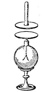 十六世纪末,威廉·吉尔伯特曾用一根被置于支枢之上的指针来证明经过摩擦的非导体上存在着电荷。十八世纪初使用的原始验电器通常由用金属丝或玻璃管悬吊的黄铜箔条或线绳构成。例如,为了研究一个带电玻璃球对附近轻物体的吸引,豪克斯贝便在一个与玻璃球同心的金属丝环上悬吊数根毛线;当玻璃球旋转时被摩擦而起电时,毛线的取向使它们的自由端径直指向球心(Physico-Mechanical Experiments,1709)。斯蒂芬·格雷在二十年后所采用的验电方法与豪克斯贝的方法酷似。但是,继迪费发现了电排斥,又引入了一种新式验电器。据格雷的朋友和同事格兰维尔·惠勒描述(Phil.Trans. ,1739,p.98),它的原始形式乃由用一根丝线并排悬吊的两根线组成;它们在有一个带电体靠近时便分离开来。惠勒给线的两端系上羽毛。后来,魏茨提出用丝线并排悬吊两块金属,以便根据它们被充电时的分离程度来把它们的相互斥同重力比较。(Abhandlung von der Elektricität,Berlin,1745)。诺莱通常把这种线对的阴影投到一块屏幕上,再用一个分度规测量它们的分离度(Mém.de L’Acad.Roy.des Sc. ,Paris,Année 1747)。约翰·坎顿在他的感应和大气电实验中,应用一根导线并排悬吊一对长各约6英寸的亚麻线,每根线支撑一个豌豆大小的软木球或老木髓球(Phil.Trans. ,1753,p.350,和1754,p.780)。按照普利斯特列的说法,悬吊的球有时放在一个带有滑动盖的窄长盒子中;使用时盒盖可用作手柄以便手持仪器(图112)。