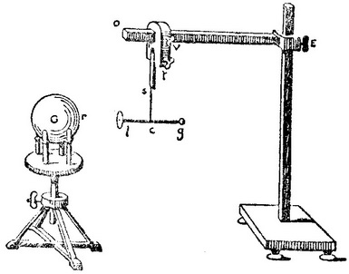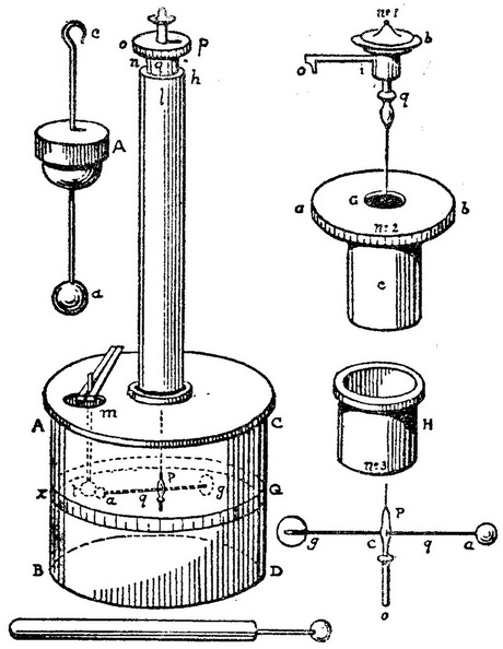 扭秤的结构和用法可用图109来说明。玻璃圆筒ABCD高和直径均约为30厘米,圆周上有刻度,上方有一块玻璃盖板,盖板上钻出了两个圆孔,一个在中央,另一个在侧旁。在中央的圆孔上升出另一个玻璃圆筒,高约60厘米,黏结于玻璃板,顶上是一个带刻度的微扭计op,从其上悬下一根细银丝qp,伸入下面的圆筒。银丝可转动一定角度,用扭头量度。银丝下端支承一根水平细杆,它是涂火漆的丝线或麦秆,一端有一个小木髓球a,另一端是一个圆纸片g,作为衡重体,并阻尼振荡。这装置的若干构件单独示于图中右侧。通过玻璃盖板上的第二个孔m,可使与第一个同样大小的第二个木髓球向下伸入在一根绝缘棒上的容器之中,并与第一个球接近。