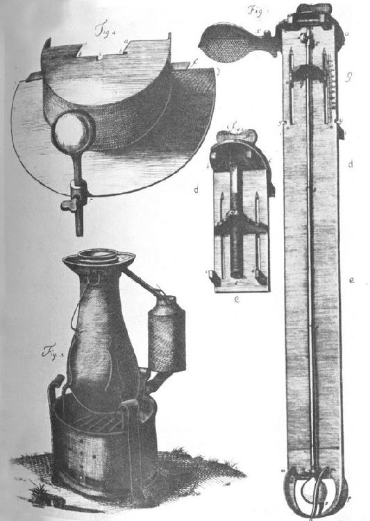 所以,德吕克的书的第二篇论述气压计和温度计的制造和使用的改良,而这正是他后来在大气定量研究上取得进展的基础。当时人们已经公认,影响气压计读数的那些因素同大气压毫无关系。许多气压计放在一起时,它们可能示出不同读数,但彼此关系不固定;每当把一个这样的气压计的管中的水银抽空再充入时,它就可能改变读数。普朗塔德记录和卡西尼描述过一些对法国山脉的气压观测,它们表明,气压计管径可能影响水银柱高度。此外,气压计的气压高度还受温度变化影响,从而引起水银密度发生相应变化。阿蒙顿曾制定了一张适用于气压计的温度修正表(Mém.de l’Acad.Roy.des