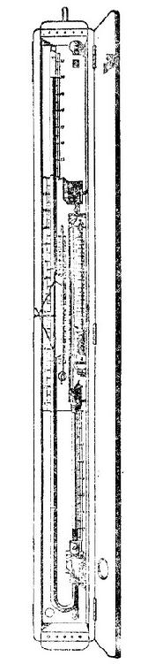在指出了以往研究者必定会陷入的陷阱,并大力排除了这些陷阱之后,德吕克把他的书的第三篇主要用来详细描述便携式气压计的设计。他在经过多次尝试之后,才最后采纳这种最适合于他的目的的气压计(图130)。它主要是一根J形管子,分成两个部分,它们通过管子短臂上的一个旋塞相连。长臂封闭,短臂在顶端开口。整个仪表封装在一个松木匣里。当仪表运往他地,尤其途中路面不平时,长臂应完全充满水银,旋塞旋紧,短臂中水银撤空。这样,便可避免长臂中水银因强烈摇晃而损失的危险。气压计底座上还装了一个温度计,以应替气压读数作温度修正之需。这整个盒装的仪表携带时像箭筒一样倒提,而当用它进行测量时,借助铅垂线把它垂直装置在一个三脚架上。