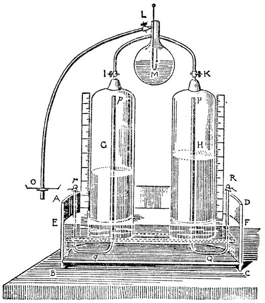 ABCD是一个内盛水的集气槽。G和H是带分度的玻璃筒。RQP和rqp是导入氧和氢的送气管。其数量被测量的气体通过旋塞I和K引入玻璃容器M,后者原先由抽气机O通过旋塞L抽气,然后在那里由电花引爆。