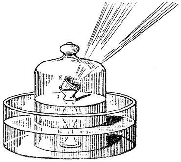 图164—拉瓦锡用取火镜在封闭空气中烤烧铅的实验。铅放在杯N之中,杯由在玻罩中的水或水银之上的支座IK支承。