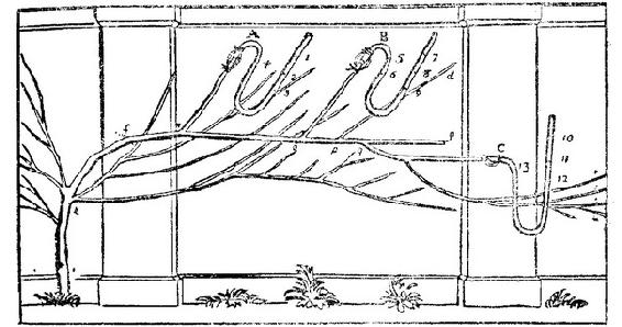 A、B、C是三个水银量规,固装于三根藤枝,其中两根已有两年,而OB老得多。水银被液汁沿管4、5、13往下推,在不同条件下推过不同距离。实验表明,液汁的力量很大,不仅从根而且还从茎和枝发出。