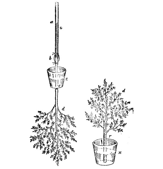 黑尔斯在十七世纪的前驱舍萨平诺、马尔比基、雷和格鲁等人已试图诉诸吸涨作用和毛细现象这类物理因素来解释植物中水的运动。但是,他们很少或者一点也不了解水在茎中连续上升而从叶面通过蒸发释出的机制(这过程今称“蒸腾作用”)。另一方面,黑尔斯实际上成功地测量了“植物和树吸收和排汗的水汽的数量。”这是很不容易的。在他从一个幸运的机遇得到启发之前,他曾对成功感到绝望。他做过血液在动物动脉中流动的实验,因此产生了一个想法,即也对液汁在植物中的运动做类似的实验。他自己这样说明这项事业。“我想,我能够做类似的实验,发现植物中液汁的力;但是,大约七年来我一直对这发现的成功感到绝望。只是由于一个偶然事件,我才悟出了这一发现。那时,我正力图用各种方法制止一株藤的一根老茎的伤流,因为它截枝的日子太靠近伤流活动期,而我恐怕这会致它于死命。在各种手段均告无效之后,我在这茎的横切口上缚上一个膀胱,我发现,液汁的力大大扩大了这膀胱。由此我得出结论:如果像我以前对几种活动物的动脉所做的那样,也以同样方式在那里固定一根长玻璃管,那我便求得液汁在该茎中的升力,而这果然按我的预料成功了。因此,我于不知不觉中不断用各种实验把研究步步推向深入”(Preface to Vegetable Staticks p.iii)。