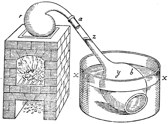 加热曲颈甑r中各种物质时产生的空气,通入放在水槽xx中的量规ab。藉助一虹吸管可将空气抽出,而水则上升到z。在加热了曲颈甑中的东西之后,水位xx下降,这下降表明有多少空气释出。(在这集气槽的一种改进型中,接收器ab和发生器r分开。见第432页上的图153。
