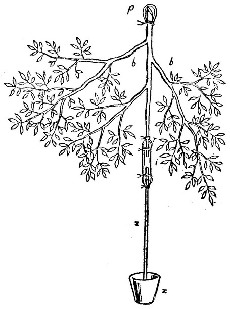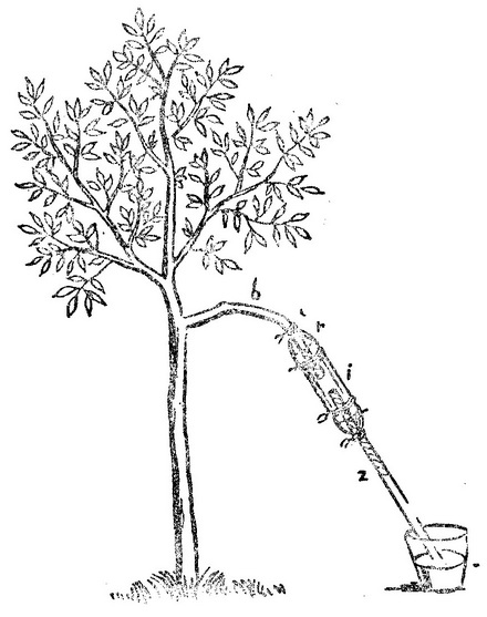 从一棵旺盛的苹果树上截取的一根枝bb的粗端p被粘结,并缚上一个湿膀胱。主丫枝在i处切断。粘接于枝ir的玻璃管zr充有水,放在水银x中。这枝吸收大量的水。“这个实验证明,枝将从浸在水中的小端强烈吸水送到大端;也从浸在水中的大端吸水到小端。”