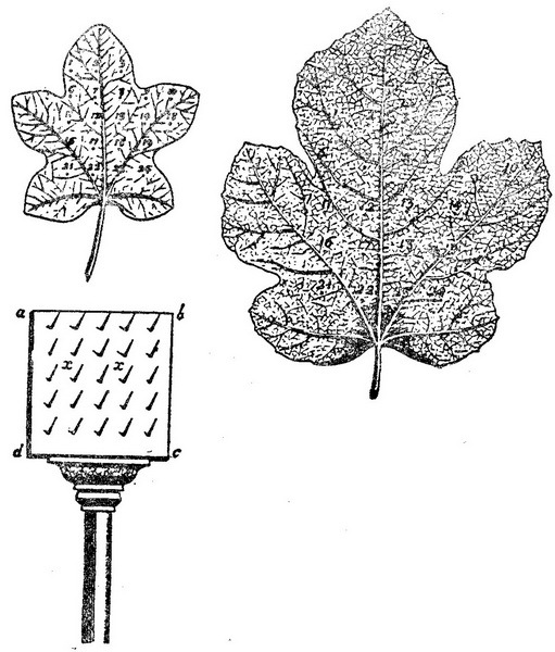 用一块栎木板abcd,按1/4英寸间距规则地钉上25枚钉子,把一张无花果叶子(左上)伏刺在钉子上面,钉子浸染过铅丹,以留下不褪的痕迹。叶子长足时(右上),这些红点按图示比例散开。