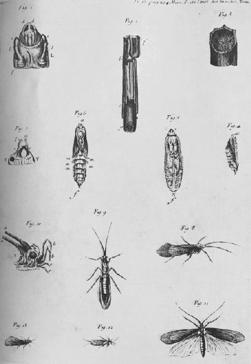 列奥弥尔在很不寻常的广义上使用“昆虫”这个术语,包括四足动物、鸟和鱼以外的一切动物。他极其细心而又极富独创性地研究这些低等动物以及它们用以保护自己脆弱身躯的那些令人赞叹的手段。因此,他的许多描述性记叙,比如对毛翅目蠕虫、中国条纹蛾的蠋和蜉蝣的说明,至今仍为一些这方面的新著录引,只是略作修改,例如L.C.米阿尔的《水生昆虫》(Aquatic Insects)(1895 年)。