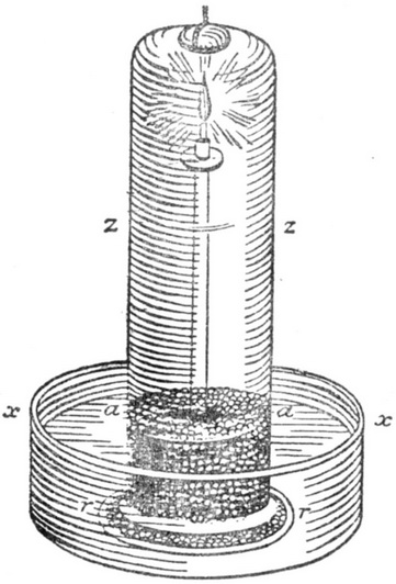 倒置的玻璃筒zzaa 用一根绳子悬吊,使它的口在水下3 或4 英寸处。用一根虹吸管把空气从玻璃筒中吸出,直至水上升到aa。当燃烧或呼吸破坏了一部分空气的弹性时,水便上升到zz,而空间aazz 表明了弹性被破坏的那部分空气的数量。反之,当支座上的物质产生空气时,水先上升到zz,而当这水再从zz 下降到aa 时,空间zzaa 便表明了所产生空气的数量。