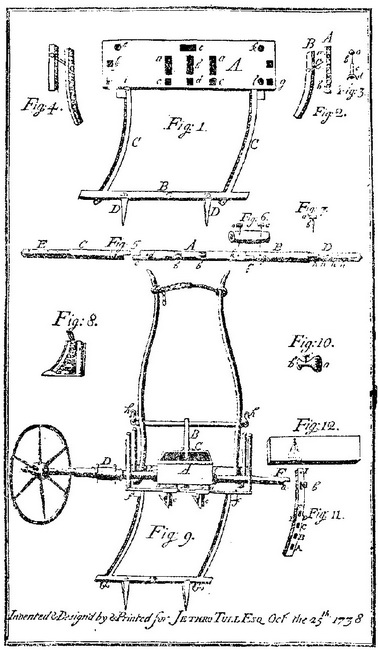 我们现在可以从犁耕的改良转到播种的改良。十七世纪之前,欧洲实际上只有两种播种方法,即撒播和穴播。谷粒和小种子一般用手撒播,种子相当均匀地撒布在整个耕地面积上。豆和马铃薯之类大种子采用穴播,也即在土壤中挖一些空穴,空穴一行行平行排列,每一行上彼此又相隔一定间距,每个空穴中放进一颗或多颗种子。撒播在耗用种子数量和花费手工劳动量上造成很大浪费,不仅如此,而且还妨碍了播种以后对土壤的有效中耕。1600年,休·普拉特爵士发明了一种铁穴播器,它固定在一块板上,这样,便于用手快速穴播玉米。然而,更为重要的是,杰思罗·塔尔在十八世纪发明畜力条播机。塔尔通过仔细的观察和实验,学到了许多关于种子和播种的知识。另外,他还发现,在一定深度上稀播种子,长出的作物最好。不过,他在劝说农夫执行他的指示时,遇到了很大困难。于是,他毫无畏惧地决心“发明一种机器,比手工更可忠诚地种植驴喜豆”。塔尔模仿管风琴的构造,尤其共鸣板的沟、簧片和弹簧,制造了一种条播机。它通过具刻痕的桶输种,种子由一轻型覆土耙掩埋,后者固装于该条播机后部。这种条播方法是撒播和穴播间的一种折中;种子成平行的行地条播,但在每一行上则是连续不断的。总之,同手工撒播相比,畜力条播机不仅节省种子和劳力,而且使得有可能对作物行间的土壤进行适当中耕,而毗连土壤的除草和充气大大改良了这些作物。为了更有效地这样做,塔尔还发明了畜力中耕锄,当时中耕全用费力费时的手锄。