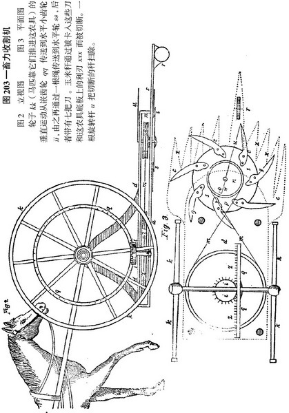 早在公元一世纪,高卢已在应用一种机械收割装置(参见Pliny:Natural History,Book XVIII,Ch.72)。它是一辆马车,正前面有一把巨大的轮刀。一头牛把马车向前推,在马车旁有一个人把玉米向后弯,以便轮刀把玉米头割下,落进马车。这种精巧的机械装置在后来几个世纪里被废弃了,或许被淡忘了。但是,在十八世纪里,人们又尝试引入这种高卢人收割机的各种改进形式。其中最精致、最有意思的一种见诸威廉·沃克的《通俗哲学》(Familiar Philosophy)(1799 年)。这种收割机有两个轮子,由一根轴连接,这轴带有一伞齿轮,后者由一带齿的构架支承,而构架贴近地面,并带有几把水平旋转的刀,而这些刀借助两个滑轮和一个小齿轮同轴上的齿轮相连。这收割机由一匹马拉动,玉米由轮刀的旋转着的刀刃切断。