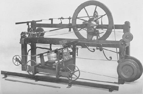 年获得了用辊纺纱方法的专利权。在这种新机器里,被梳理的棉或毛由一对辊引入机器,再传送到另一对辊,后者比第一对辊运动快,这样,棉或毛在从第一对辊到第二对辊的传送过程中,就被伸张了。这纱线从辊再传送到锭子和锭翼,最后缠绕在有边筒子上。