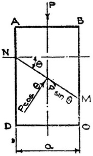 库仑接着研究石造物对倾向压毁它们的力的抗力。在图214 中,当负载P沿某个斜面NM 作用的分量克服沿该处的内粘抗力时,石造物ABCD 便会毁坏。此时,ABMN 便下滑。沿MN 的每单位面积c 磅的抗力(这石造物沿图示平面的尺寸为a,沿垂直于此平面的方向的尺寸为b)将等于c·b·a secθ。这力必须抵抗的那个P 的分量为Psinθ。使这两个力相等,我们便得到
