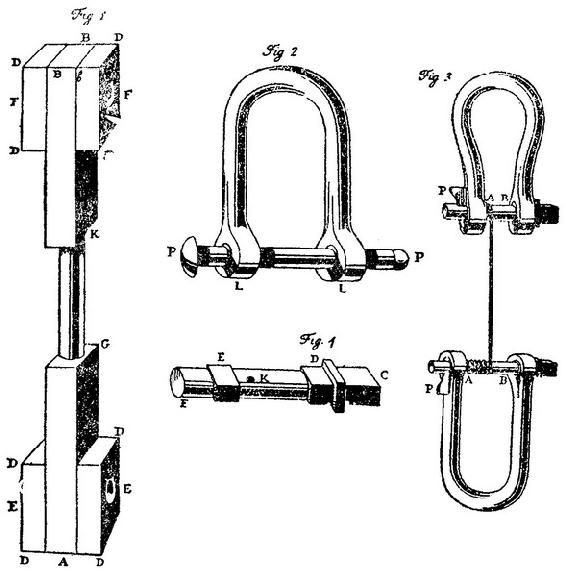 这一时期有记载的试验中,布丰做的金属试件最大。他对木材的试验(参见第657 页)中,负载通过支持被试验巨木的一个铁钩环传送。或许最初的钩环有一个在使用时裂断了,因此,为了进行比较,就故意把其他的也裂断(布丰:Histoire des Mineraux Oeuvres complètes,1774—8,Vol. Ⅶ,p.61 )。每肢大小近似为直径18.5线即约为2平方英寸的一个铁钩环在28000 利弗尔 [1] 负载作用下裂断,这负载相当于约每平方英寸6000 磅的应力。四次这种试验平均仅约每平方英寸7000 磅,而同样材料的金属丝则要强十二倍。这有趣地从侧面说明了这时期棒铁质量之低劣。