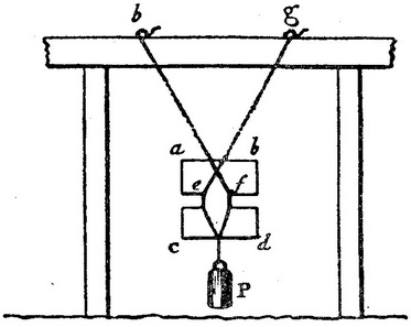 马里奥特曾用哑铃状的拉力试样做过实验(图207)。米欣布罗克用玻璃试样做实验时,仍保留这种方式。但是,他不用绳索来悬挂它们,因为这种方法必定带来不确定的加载偏心度。他设计了一种新颖的U