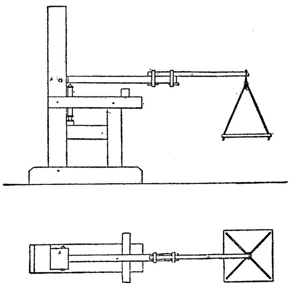 吉拉尔的试验机所以特别令人感兴趣,是因为它的尺寸小,却可用于试验大截面木材。所列的最大试件几乎达17 英尺长、11 英寸见方。这台机器按设计可以施加高达100 吨的负载,但他的结果表中所载,却未见有超过140000 磅者。在图217 中,示出一处于试验位置的二米半长的支撑。图中表明了吉拉尔试图用以避免方向上约束的方法。支撑立在一个铁基R 上。负载有一部分不是通过楣窗K 和立柱AB 传递到那个载重梁XY 绕其自由倾斜的枢。铁基R 把这一部分传给一木质格床(图218 中的平面图所示)来承重。构成试验机主架的立柱AB伸入地基达3.5米,在那深处它们由十字接件D相连。当欲用此试验机作挠曲试验时,用一根更长的大截面木头取代铁块R来承重梁的承座。一根立柱以与支撑试件相同方式安装,它向中跨施加一个点负载。图217 所示的脚手架和辘轳足以表明这些试验的艰辛。这些试验是在职业工作的闲暇期做的,所以,四十八页的表格的记录和结论花了几年工夫才完成。