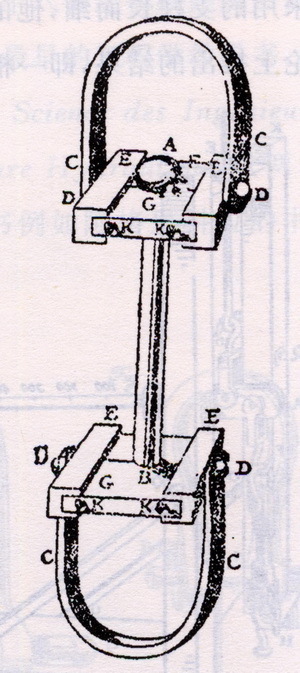 罗齐埃在《观察》中描述了戈特的试验机,但未附草图。不过,他的外甥纳维埃在1809 年出版的他的《论桥》(Traité des Ponts)的那个版本和隆德莱的《建筑的艺术》(L’Art de Bâtir)都提供了草图,图215 即采自后一本书。