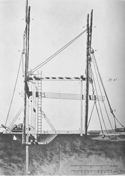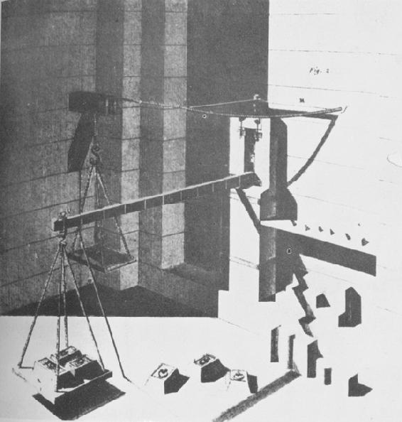 5 英寸木材制成的载重台系14 英尺长、6 英尺宽,连钩环和载重用的全部吊索共重2500 磅。开凿三百块重石并加以修琢,重量标为25、50、100、150