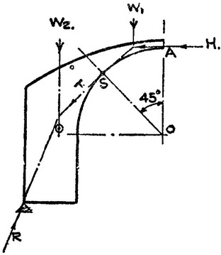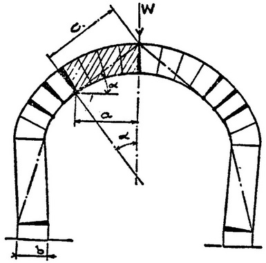 当一负载W 作用于拱顶时,拱腹倾向于在此负载的下面崩开。同时,拱背倾向于在拱腋处崩开。受影响的接缝处的粗锥形线表明了关键接缝。拱的重量同W 结合所产生的合推力沿图中一链虚线所示的方向。