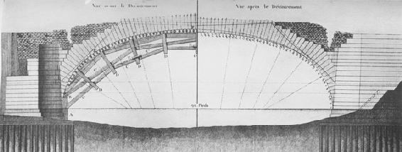 J.R.佩罗内在一个空前发展时期担负法国市政工程工作。因此,他具备得天独厚的条件来通过观察和主动实验获得数据。例如,在建造塞纳河畔诺让的圣埃德姆大桥时,就做了一个实验:在拱建成之前,先试验建造拱腋上墙的一部分。这座大桥是一个跨度96 英尺、拱高29 英尺6 英寸的椭圆拱(参见Mém.l’Acad.Roy.des Sciences,1773,pp.63 f.和图228)。这压低了在拱腋处的拱赝架,致使拱和拱肩填充物之间出现间隙。沿拱的边沿标上水平线。建好拱顶之后,马上就定中心,测量沉陷。间隙闭合了。但是,观察到拱圈出现明显变形,而这清楚地显示了合压力的走向和破裂点倾向出现的地方。这个现象以往只在小的模型中观察到。