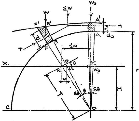 拉伊尔考虑了,一个由光滑拱楔块辐式接合而成的拱能够保持稳定的条件。每块楔块均受到其自身重量和各相邻楔块的法向压力的作用。拱顶的石块起楔的作用,倾向于使各拱腋分离和跌落。如此产生的推力同石块重量相结合,一起从一个楔块传到另一个,最后传到拱座。从匿名提供给《哲学杂志》(Philosophical Magazine)第38 卷(1811 年,第387 和409 页)发表的一篇论文中,可以看到拉伊尔、帕朗、库普勒、埃梅尔松和其他人制定这理论及其应用的步骤。这论证的大意可参照图225 扼述如下。可以证明,在A 和B 处的两楔块的重量Wo 和W,同这两楔块的面所处平面沿水平线KX所截成的截距成正比。当角θ增大时,这两个截距也随之同sec2θ成正比地增大,而当θ在近起拱点处趋近直角时,仅仅重量所造成的平衡将要求无限重的楔块。然而,正是在起拱点附近,摩擦的效应达到最大。