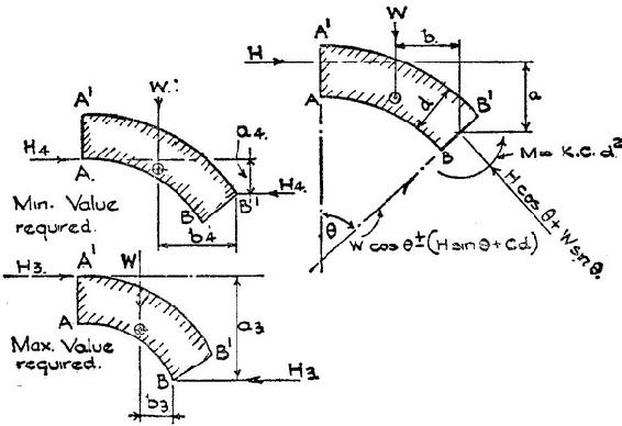 在图229 中,一个拱肋AA'B'B 即将毁坏时,其一部分保持平衡的条件的确定问题,可以归结为求下述两种情形里的水平推力H:为阻止逆时钟旋转因而使A 和B'处接缝开裂所必需的最大值H3;和将不导致顺时针转动及接缝在A'和B 处开裂的最小值H4。这两个最大和最小值下的截面积可分别用尝试法求得。