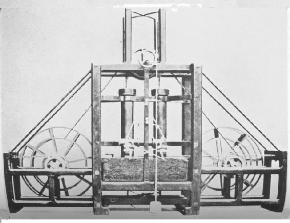 1788 年,一个爱丁堡银行家帕特里克·米勒做了双体明轮船的实验。有人劝他给这船装设蒸汽机,取代费事而又费用高昂的人力和绞盘驱动。他聘请威廉·赛明顿(1764—1831)按照后者在1787 年获得专利权的那种型式(图261)制造一台蒸汽机。两个顶端开口的汽缸按空气原理工作,但配备有单独的喷射凝汽器。汽缸直径为4 英寸,冲程18 英寸,两个活塞交替地拉动一条经过一个滑轮的链。一个链系传递动力,使两根明轮轴上的链轮松开,这样,这动力经过棘轮而作用于安装在两个船体之间的明轮。这船长25 英尺,最大宽度7 英尺。据说,这小船在达尔斯温顿湖上试航时,时速达5 英里(图262)。