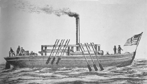 1763 年,宾夕法尼亚州兰开斯特的一个机智的机械师威廉·亨利尝试把瓦特式蒸汽机用于明轮船。这船因事故而沉没了。他再次作了尝试,但未获得能证明这冒险在商业上合理的成功。