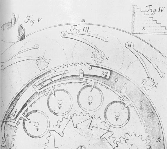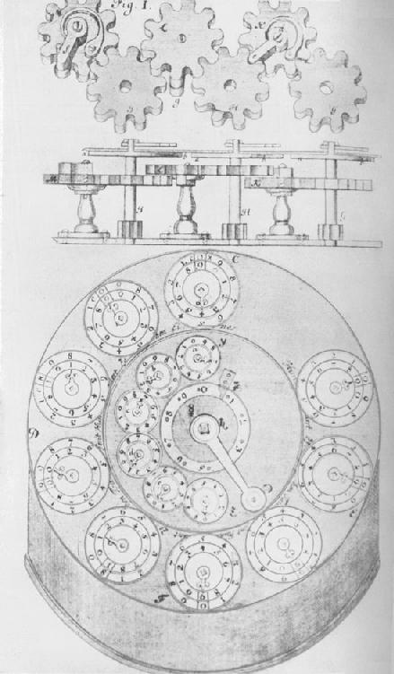 507ff.)。它的机器是一根单轴,上面装上一些短的黄杨木圆筒即木轮,它们接连放置,一般都能独立地围绕这轴转动。这些木轮的曲表面上刻有0 到9 十个数字,它们整个地放在一个长约3 英寸的小匣子中,此匣带有一些缝隙,通过它们可以看到数字。这些木轮用一根针转动,每当有一个木轮转过十个分度而完成一圈,左邻的那个木轮便向前移动一个分度。为此,每一个木轮都沿其一个平表面的整个圆周刻成锯齿形,其另一平表面则附装上一根平衡杆,即一根能像跷跷板那样绕其中心摇动的径向杠杆,它在一端有一个钩,在另一端有一个斜面。每当这木轮的圆周向前转过十个分度,平衡杆的斜面便遇到一个捕捉器,后者固定于把每对相邻木轮分隔开来的镀锡铁板上。这捕捉器把平衡杆的该端往下压入木轮厚度上的一个榫眼之中。于是,另一端上的钩便突出。它通过镀锡铁板上的一个开口,同相邻木轮的一个嵌齿啮合,使这木轮向前转动一位。但在能继续推动这木轮之前,斜面脱离捕捉器,钩则在一根弹簧作用下退回正常位置。于是,这相邻木轮便处于不受扰动的状况,直到又移过十个分度。