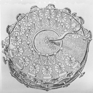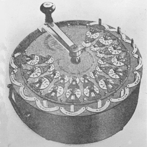 这类主要用于乘法的机器,还有德国人在十八世纪末发明的两台。其中第一台是马特·哈恩耗巨资发明和制造的。他是路德维希堡一个有机械素养的牧师。它的外部特征的描述以及使用说明发表于《德意志报道者》(Der teutsche Merkur)(1779 年5 月)。这种机器在附近一带引起很大兴趣。不过,它的内部结构没有透露。哈恩的儿子在1809 年复制了一台,保存在斯图加特。直至上世纪末,它还在运转。关于哈恩机器有严重缺陷的传闻,激励德国工程师J.H.米勒制造了一台据他称是优越的仪器(图328)。他想出了好几种可供选择的主意,结果选择并制定了其中一种,它使他制成一台酷似哈恩的机器。米勒的发明在《德意志报道者》(1784 年5 月)上宣布。他的朋友P.克利普施泰因于1786 年编著了一本小册子《他新制成的计算机器的说明》(Beschreibung seiner neu erfundenen Rechenmaschine),说明了他的机器的外貌和使用规则(但关于它的内部结构则语焉不详)。米勒的机器封装在一个镀金黄铜圆筒形机壳之中,后者直径10.5 英寸,深3.5英寸。上表面带有十四对度盘,构成一个外环和一个内环,又有十四个带刻度的螺丝头围绕这圆筒的曲面分布,同相应的度盘对相对立。整个装置顶上是一根大曲柄,它只沿一个方向自由转动。在把两个数相加时,外度盘的定位表示其中一个数,螺丝头则表示另一个数(后一个数的个位、十位等等分别置于前一个数的个位、十位等等之下),多余的度盘一律置于零。只要转动手柄一次,外度盘环上的读数便变为所需之和。乘法像在洛伊波尔德的机器中一样进行。米勒的机器里设置了一个铃,每当试图进行不可能的运算时,便发出报警声。