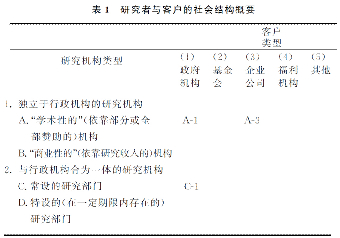 要获得研究者与客户之间社会关系的各种结构的系统认识,我们只能把两种研究机构的变量和客户的变量(像下列样本分类的那样)进行交叉分类。