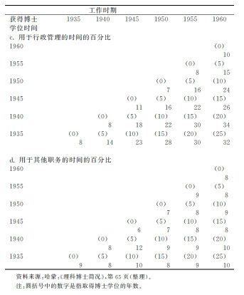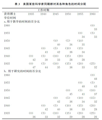其次,表3还反映了美国科学家在其生涯的每一阶段,用于不同角色的时间分配方面的历史变迁模式。这可以从表3的前两部分(a和b)其自左到右的对角线的数字中看出。例如,对角线上端的那部分人刚刚取得博士学位。现在更近的每一个距同期群,用于教学的总时间越少,而用于研究的时间越多。在科学家生涯的其他各个阶段,其变化的历史趋势也大致是,用于教学的总时间有所下降,而用于研究的时间有所增加,但1945年同期群的戏剧性偏离则是例外(请注意,1945年一行似乎与表的a和b两部分中每一对角线都不协调)。第二次世界大战后大量退伍军人涌入高校,这似乎对1945年开始其事业的同期群产生了持久的影响,在每一相继的时期持续地打破一般同期群用于教学的时间减少、用于研究的时间增多的趋势。