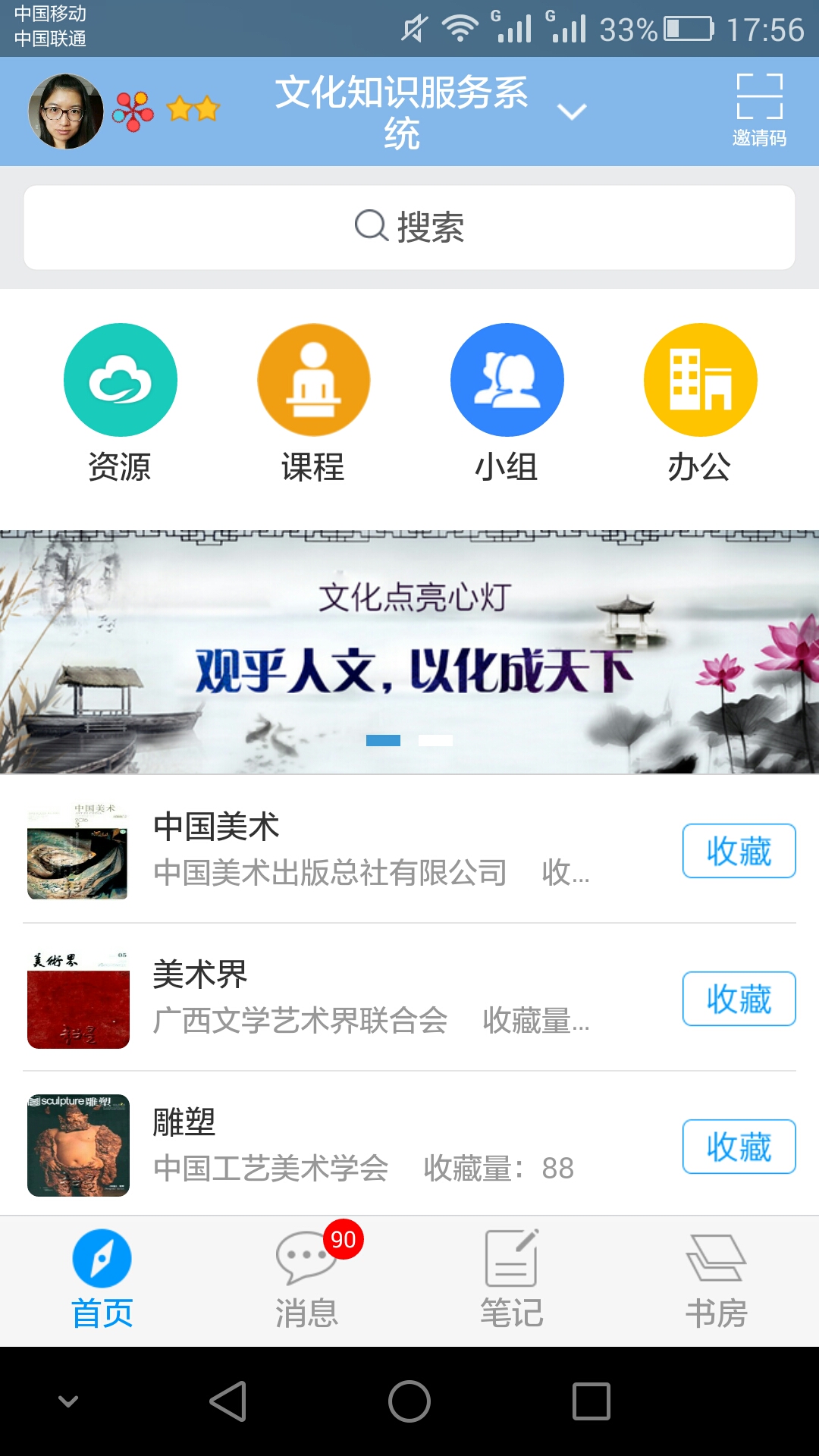点击打开“超星学习通”APP,用户登录完成后点击右上角【邀请码】,输入邀请码:wz1212,点击【确认】后进入“文化知识服务系统”首页,如图1。首页主要包括上下两部分内容:模块标签(资源、课程、小组和办公)和“瀑布流”推荐资源。