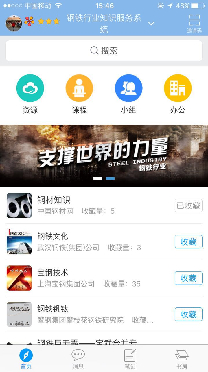 点击打开“超星学习通”APP,用户登录完成后点击右上角【邀请码】,输入邀请码:st0001,点击【确认】后进入“钢铁行业知识服务系统”首页,如图1。首页主要包括上下两部分内容:模块标签(资源、课程、小组和办公)和“瀑布流”推荐资源。