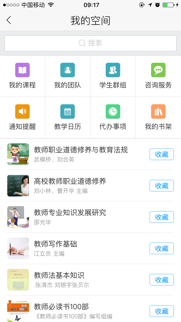 我的空间:教师的个性化专属空间,身份自动匹配。含:我的课程、我的团队、学生群组、咨询服务、通知提醒、教学日历、待办事项、我的书架等。