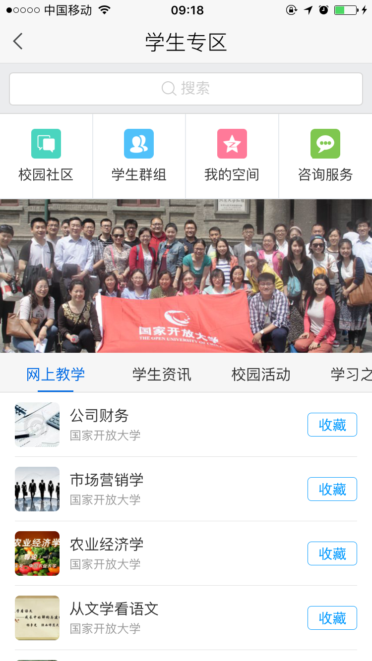 主栏目模块有校园社区、学生群组、我的空间、咨询服务等。