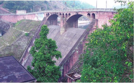 2.两岔水库坝址。位于重庆市渝北区大湾镇黄杨村五社吕家湾。两岔水库是以灌溉为主的中型水库,1976年6月由四川省水利学校设计,当年年底开始施工。大坝工程于1977年9月竣工,水利枢纽工程至1983年5月基本建成。库区蓄水面积68.3平方千米,总库容约3 660万立方米,河床标高388米,正常水面水位面积215万平方米,可灌溉渝北区龙兴、石船和统景等地农田9.59万亩。大坝工程为组合式砌石重力坝,坝高44.3米,坝顶长142米、宽5.5米,占地面积约2 000平方米,坝面可行机动车,坝体上部为拱桥,两跨。两岔水库坝址于2010年11月被公布为渝北区文物保护单位。