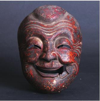 10.人物面具2。清代文物。通高22.7厘米,通宽16.6厘米,厚8.2厘米,重190克。木质,整木雕刻人物面具。面具五官透通,面带笑容,肉吉突出。右嘴角下有残缺及裂缝。现藏于渝北区文物管理所。