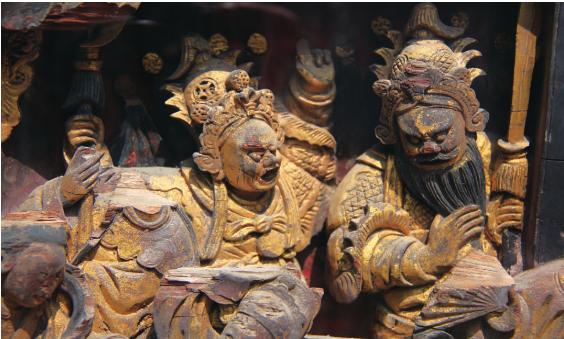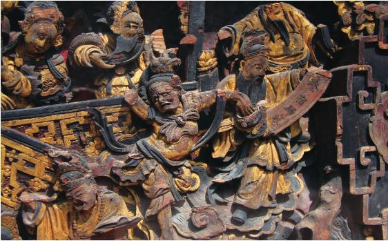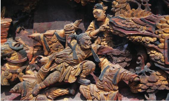 5.金木雕戏台看枋。清代文物。1985年征集于原江北区静观镇。它是古戏台上用于横向连接的构件,多于看枋正立面装饰图案纹饰,形成独具特色的艺术风格。该戏台看枋系金木雕,制作于清嘉庆年间,应用高浮雕近圆雕的工艺,于十组如意开光内雕刻各类栩栩如生的人物,或怒目愠面、或悠然自得、或笑态可掬、或庄严肃穆,无不生动传神。图案内容取材于《封神榜》《三国演义》《说唐》《水浒传》《红楼梦》,还有八仙、魁星等人物。它继承了清中期宗教造像传统,注重面部刻画,面庞大多圆润、丰满。利用开光的组合形式,再现了多组戏剧情节。在雕刻手法上浑厚凝重,用刀刚劲有力,人物的姿态、动作和表情都作了极其细腻的刻画,具有很强的写实性。特别是武士盔甲上的纹饰丰富而细致,文官服饰衣褶流畅而明快,具有厚重感。国家三级文物,现藏于渝北区文物管理所。