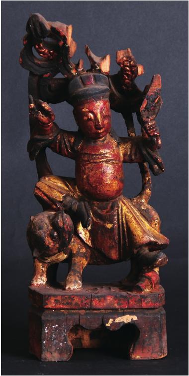 7.金髹药王像。清代文物。器物通高35.8厘米,座高7厘米,座长14.2厘米,座宽8.5厘米,像高22.7厘米,重883克。木质,器物采用圆雕雕刻方式雕刻药王执蛇骑虎像,左手执游蛇,右手执一物,已残缺。现藏于渝北区文物管理所。