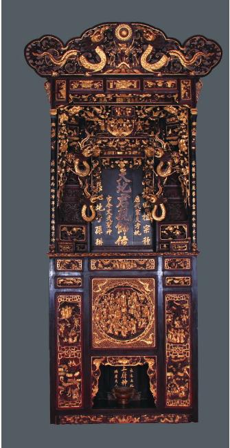 4.满金雕花家神龛。清代文物。1991年征集于原两岔乡人民政府。通高458厘米,宽170厘米,厚67厘米。神龛正中列“天地君亲师”牌位,该家神龛制作于清代晚期,图案内容丰富,结构复杂,雕刻工艺精湛,金漆交错,庄严辉煌,巍峨壮丽。其形象之高大,用金之厚重,雕刻之精美,堪为世间所罕见。神龛为坊楼结构,由座、坊、顶组成,神位立于坊内龛座正中。坊楼内柱盘4条欲腾空翱翔之游龙,外柱饰花罩,挂抱柱匾,右题“采蘋蘩以荐馨香当报水源木本”,左题“列俎豆而酬沛泽不忘祖德宗功”,顶饰二龙抢宝图案。楣板和花板中雕刻了反映忠孝节义、吉祥幸福内容的各种图案,有葡萄藤蔓、全家福、花鸟纹、教子有方图、八仙上寿图、牡丹花鸟图、槐荫送子图和祭祖应天图。龛座神位下方采用高浮雕手法于圆形开光内饰群仙图,雕刻灵宝天尊、道德天尊诸神仙,以及八仙赐福、魁星点斗、刘海戏蟾等神话故事,群仙各具情态、栩栩如生。两旁花板还绘有寓意吉祥的“三阳开泰”图,反映文人学士追求超凡脱俗、清心无为思想的“渔樵耕读”图,有寓意幸福长寿的“贺(鹤)寿(兽)千秋”图,还有“魁星点斗”“三星高照”“白娘子盗仙草”“黛玉葬花”等内容相配。所表达的文化内涵极其丰富,体现了凡事求神、四季平安的世俗思想。国家二级文物,现藏于渝北区文物管理所。