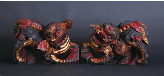 6.座匾狮。清代文物。征集于偏岩乡响水村,由村民王凤海上交。左狮通长34.3厘米,通高23.5厘米,通宽14.8厘米,重3 725克。右狮通长34.3厘米,通高24厘米,通宽13.5厘米,重3 378克。木质,原为大门上的雕件。狮子胸部及大腿处各有一个直径1.5~1.8厘米圆孔,用于悬挂。纹饰采用圆雕手法雕刻,狮身采用金木雕髹漆工艺,以朱红色漆为底漆,上方点缀金髹。现藏于渝北区文物管理所。